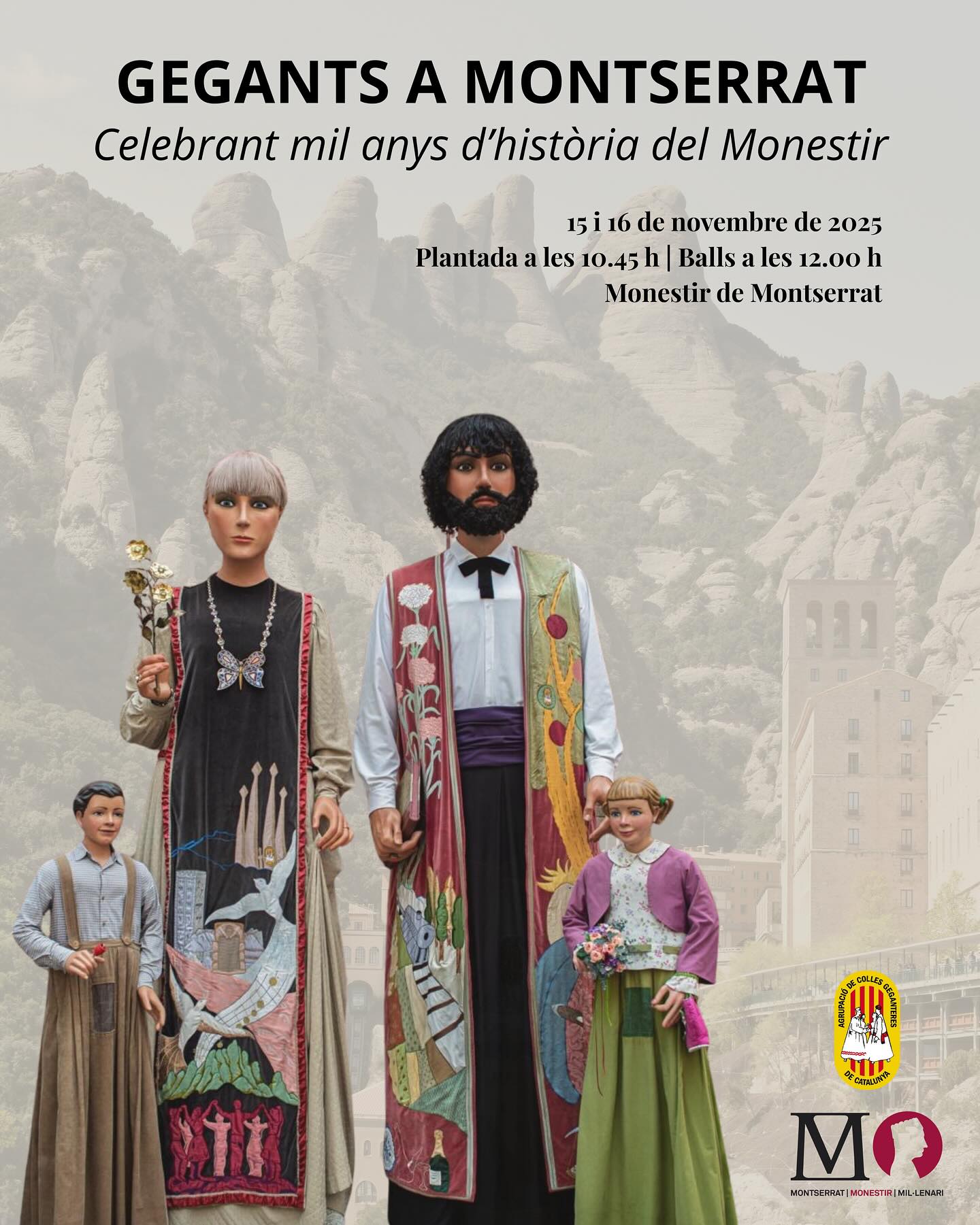 Els pròxims 15 i 16 de novembre, Montserrat acollirà una trobada de gegants amb motiu del mil·lenari del monestir, una cita que reunirà colles d’arreu per retre homenatge a mil anys de tradició, fe i cultura. S’espera la participació de 100 colles geganteres, que es repartiran entre els dos dies de celebració.