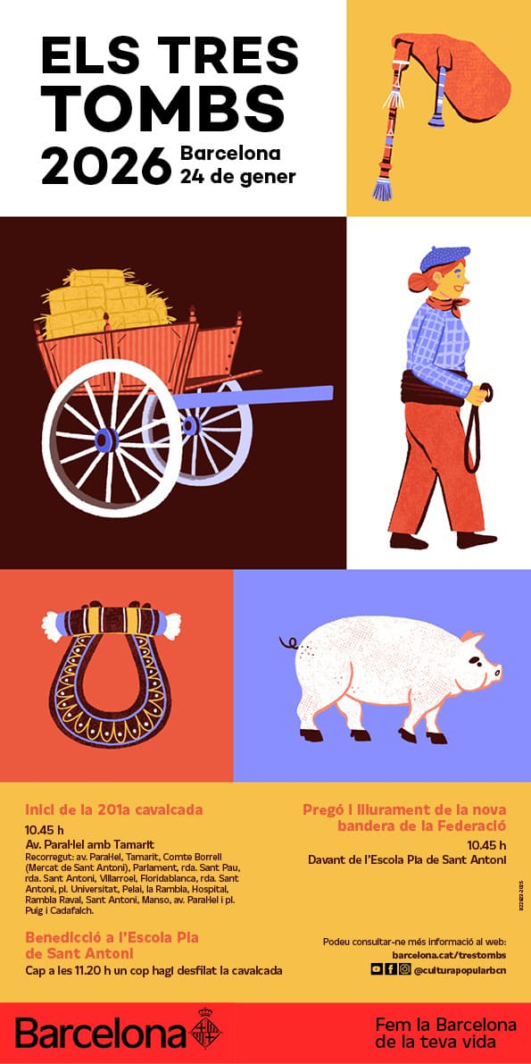 La Cavalcada dels Tres Tombs és un dels actes més populars de tots els que es fan al llarg de l’any a Barcelona, i està formada per nombrosos carruatges amb cavalls, ases i someres que recorren diversos carrers del barri de Sant Antoni i del centre de la ciutat, tot presentant el gran patrimoni històric del transport ciutadà, urbà, d’agència o de pagès del país.